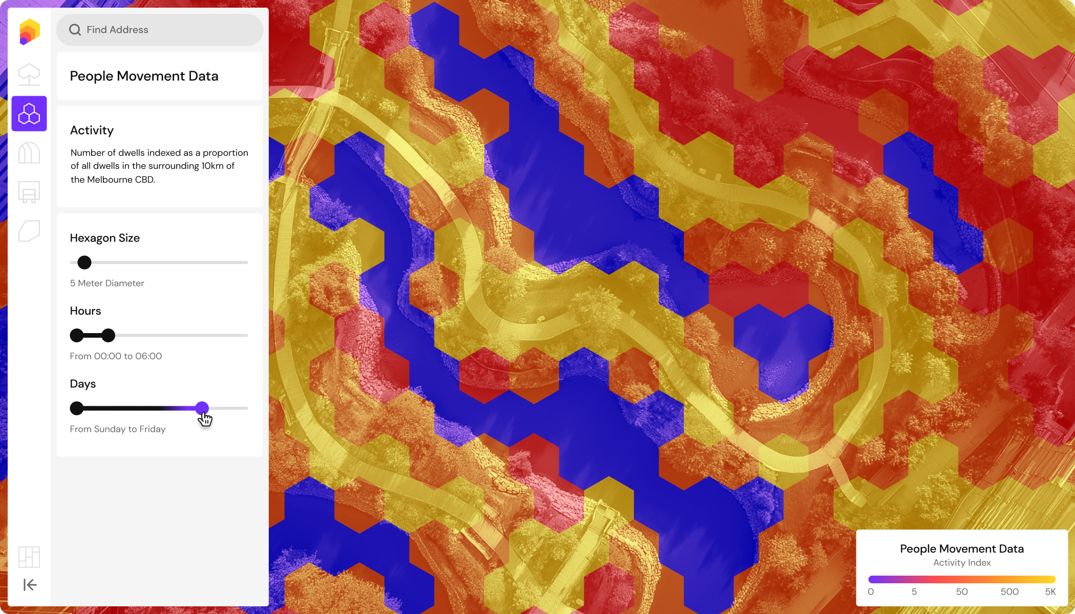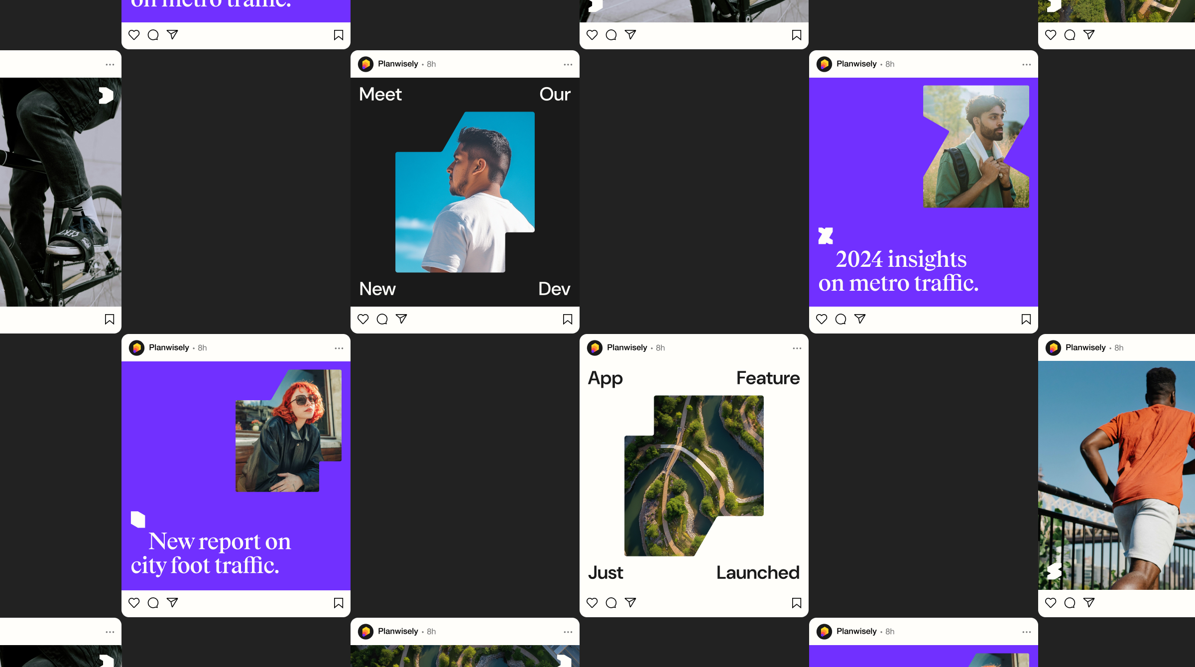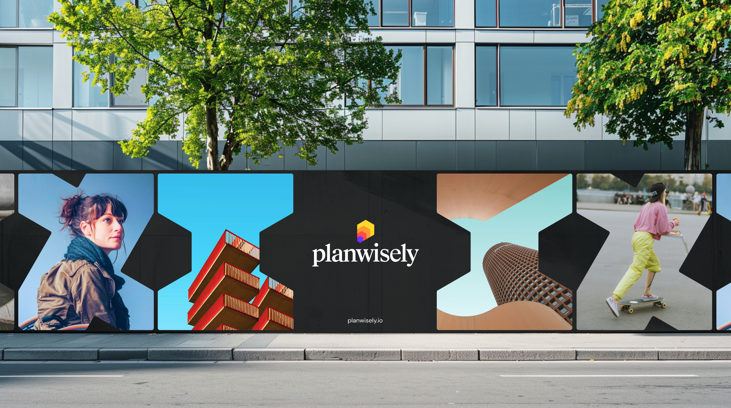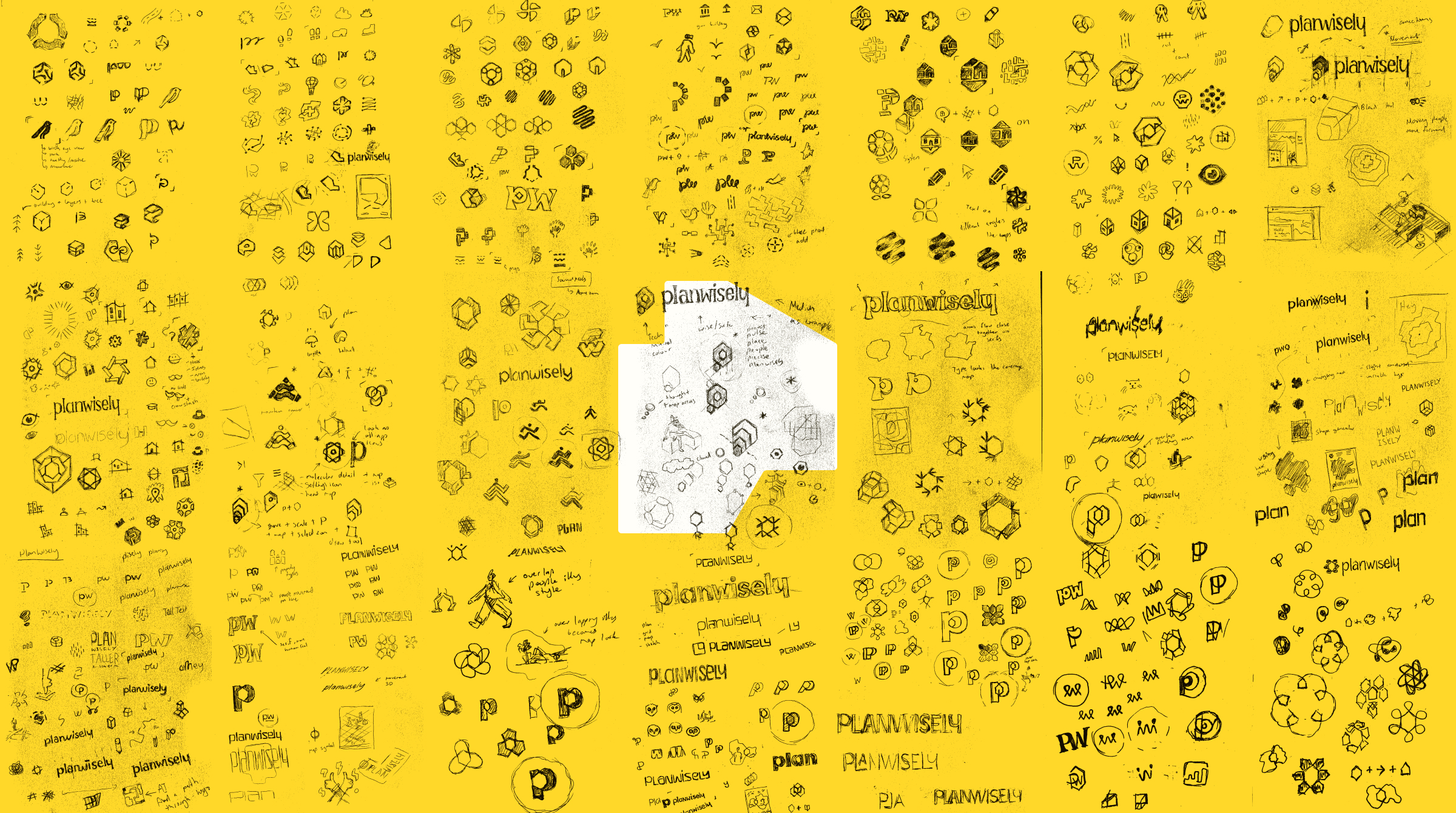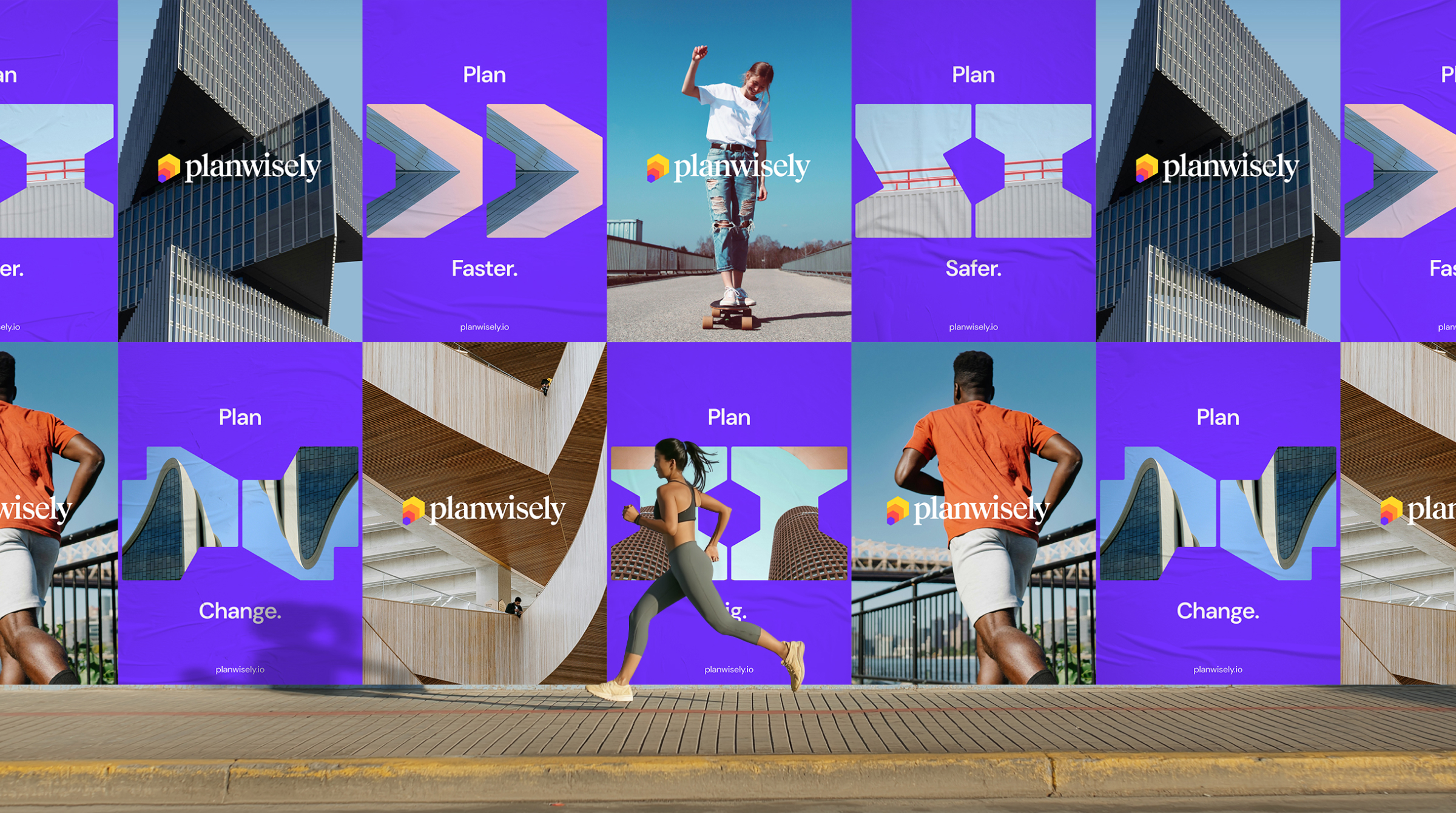 The new brand identity is built around Planwiselys core service – the people movement heat map. This is represented universally as a repeating multicoloured hexagon pattern. Repeated and scaled up, the hexagon forms the abstract P of the logo Icon which also takes on the look of a 3D building (an in app feature) and a shape selection tool (another app feature). It also conveys a sense of movement which is echoed in the brand layouts across different formats.